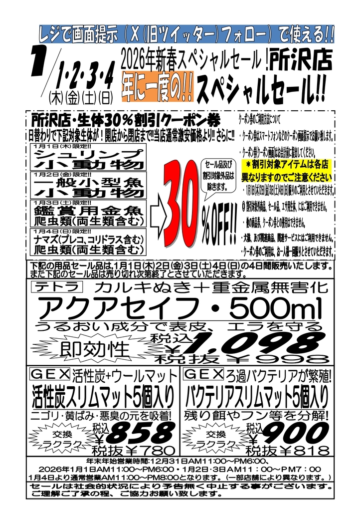 January 1st (Thurs) - 4th (Sun) 2026 New Year Special Sale! Once a year!! 30% off coupon sale on live animals!
