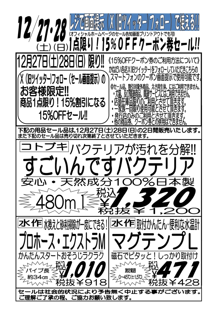 Show this screen (follow X) at the register from Saturday, December 27th to Sunday, December 28th to use it! Limited to one item! 15% OFF coupon sale!