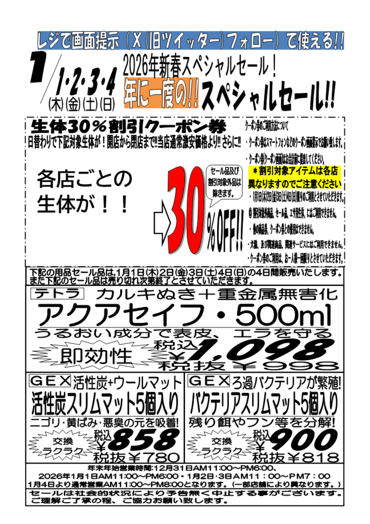 30% off coupon for living creatures only available from January 1st (Thurs) to 4th (Sun) The following living creatures will be available on a different day only from January 1st (Thurs) to 4th (Sun) 30% off on the usual super low price! *Discounted living creatures vary by store. Please contact each store directly for details. How to use the coupon : - Cannot be used on non-discounted products, sale items, or living creatures used for food. - Customers using the internet should present this screen on a smartphone or other device before paying . - Valid only from January 1st (Thurs) to 4th (Sun). - Coupon can only be used once per person. - Cannot be used in conjunction with other gift certificates or coupons. ◎ Cannot be used on non-discounted products, sale items, or living creatures used for food. |