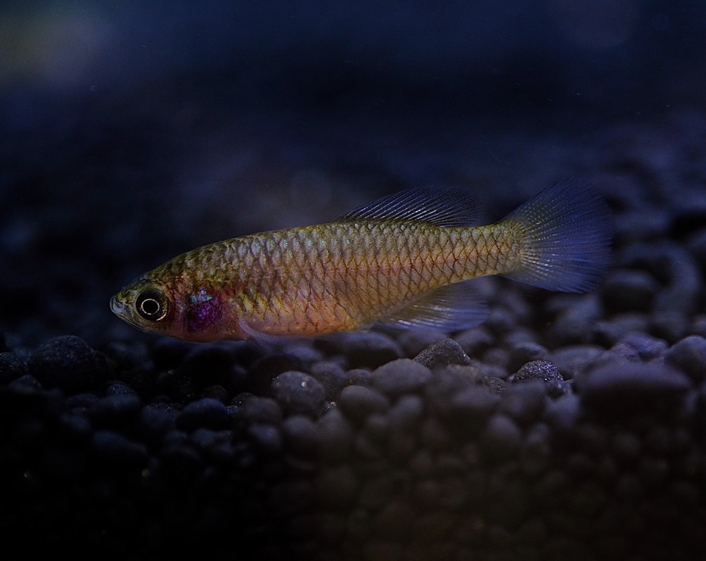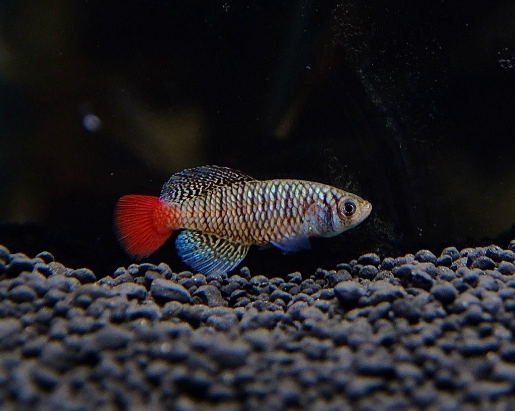 The males, with their bluish-purple to metallic blue body color and striking crimson tail fins, as well as the females, have a striking, pearly sheen that distinguishes them from their drab counterparts. Their