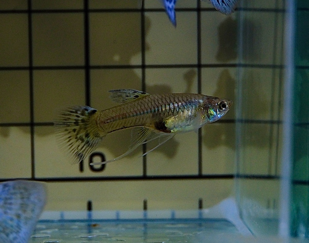 This beautiful trio is eye-catching, featuring the pale, transparent bluegrass coloration that spreads across the caudal fin and the delicately elongated ribbon fins on the pectoral and pelvic fins. The male's body lines are clearly defined, and the spotted pattern on the caudal fin in particular stands out vividly in the light. The female also boasts the elegant coloration and body shape typical of the bluegrass family, making them the perfect match for breeding.