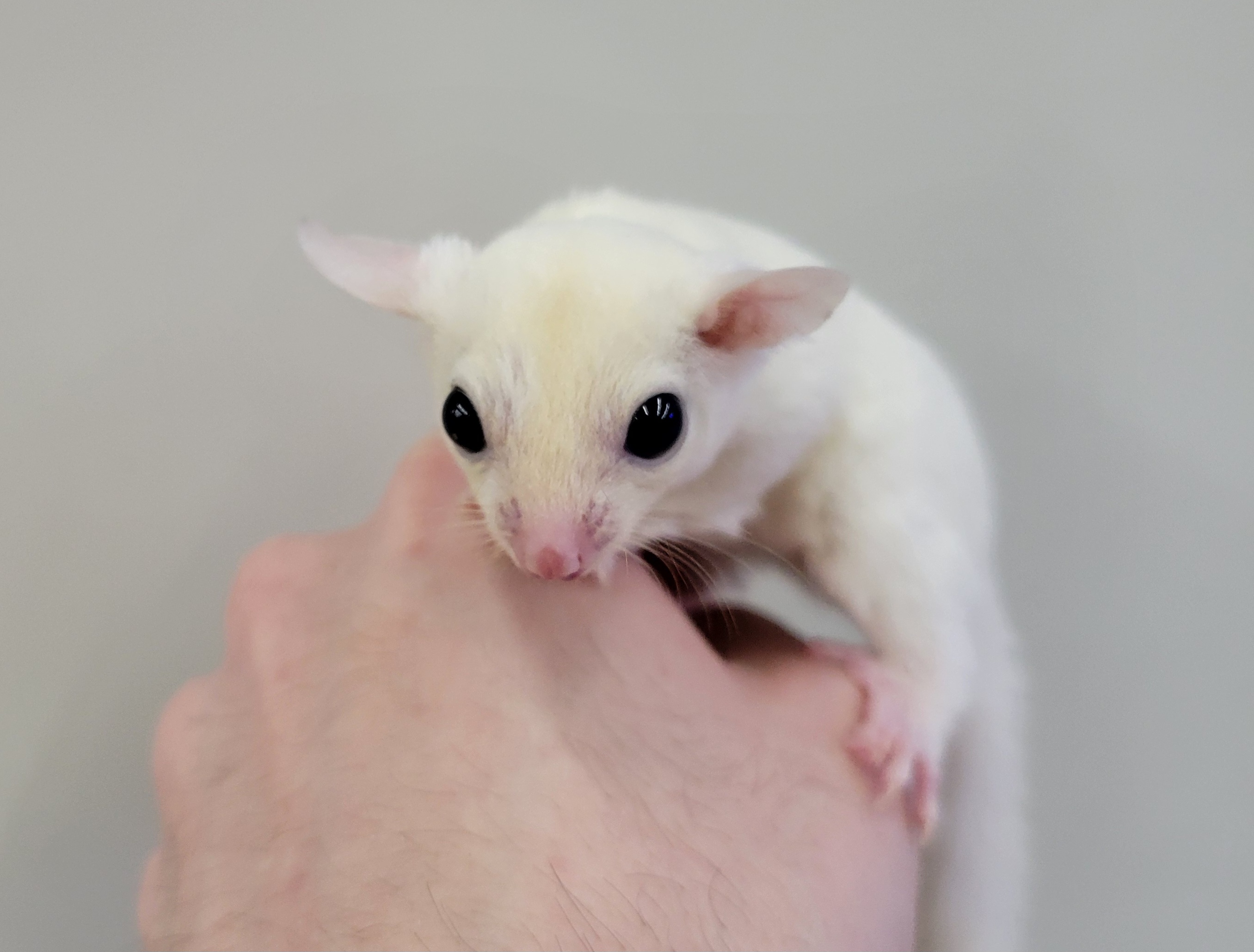 sugar glider, Lucius, is striking with his translucent white fur and large, black eyes. As you can see from the photo, his fluffy white body complemented by his pink nose and paws makes him a truly mystical and adorable creature. Once