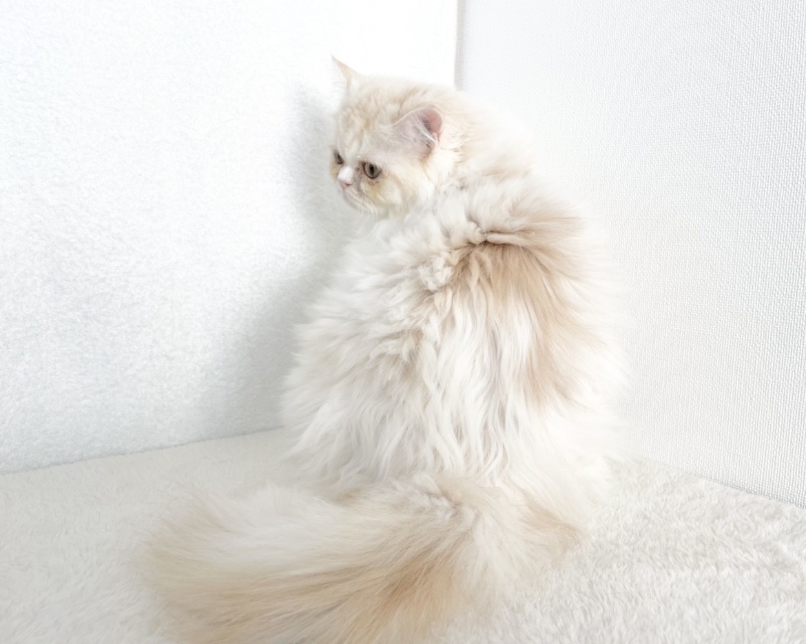 He's a male Ragamuffin with long, fluffy fur that's a gentle mix of cream tabby and white.