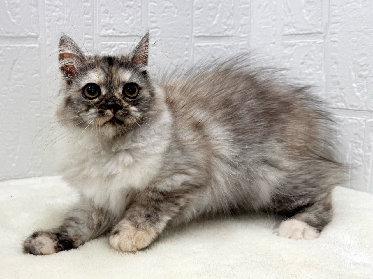 Her fluffy silver patched tabby pattern makes her look like a little stuffed animal, and she's so cute you'll want to cuddle her right away. ❤️