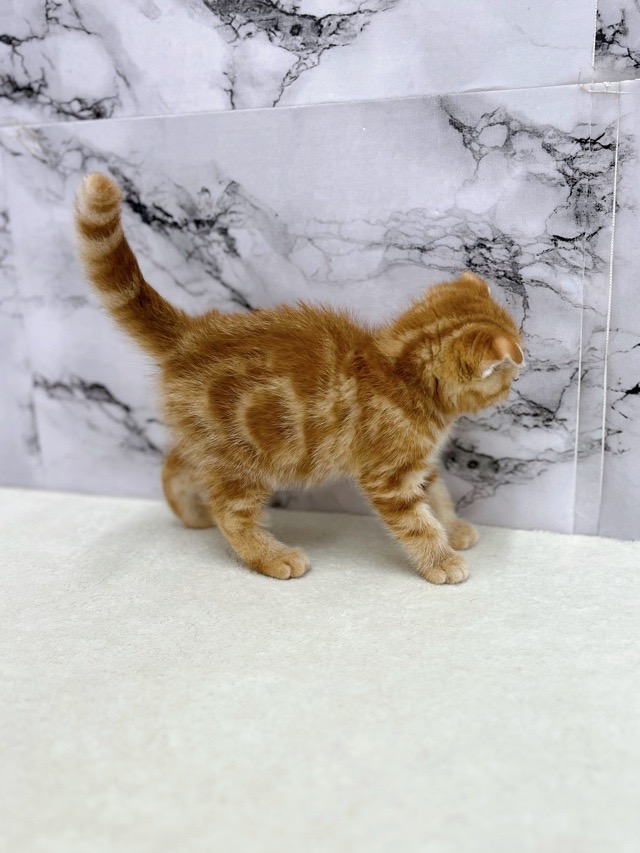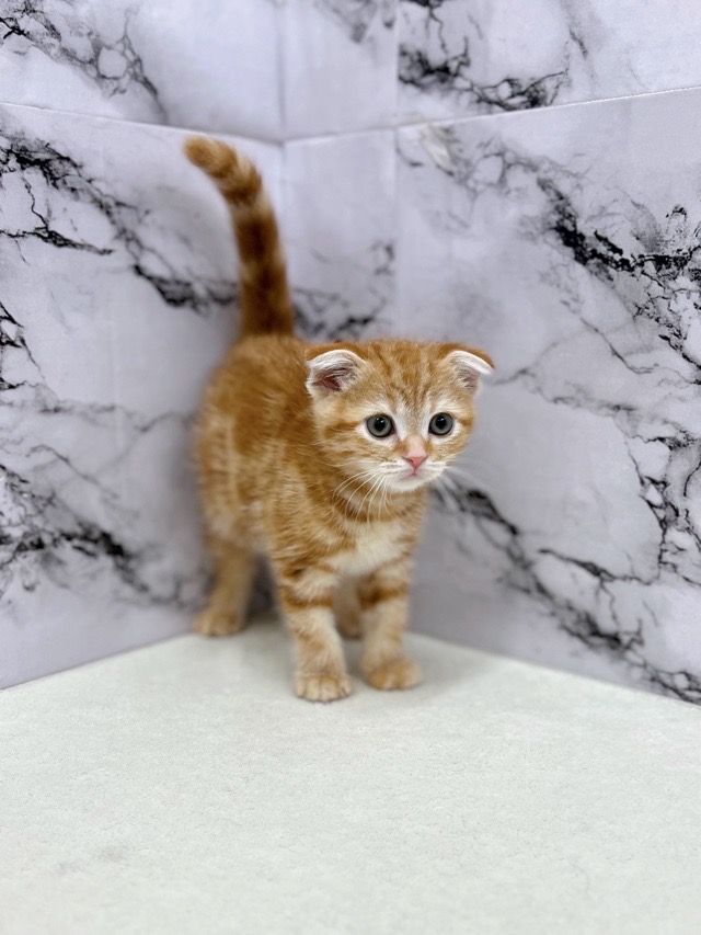 This boy has the soft features of a Scottish Fold and gently drooping ears. His warm red tabby coat color enhances his calm and composed demeanor.