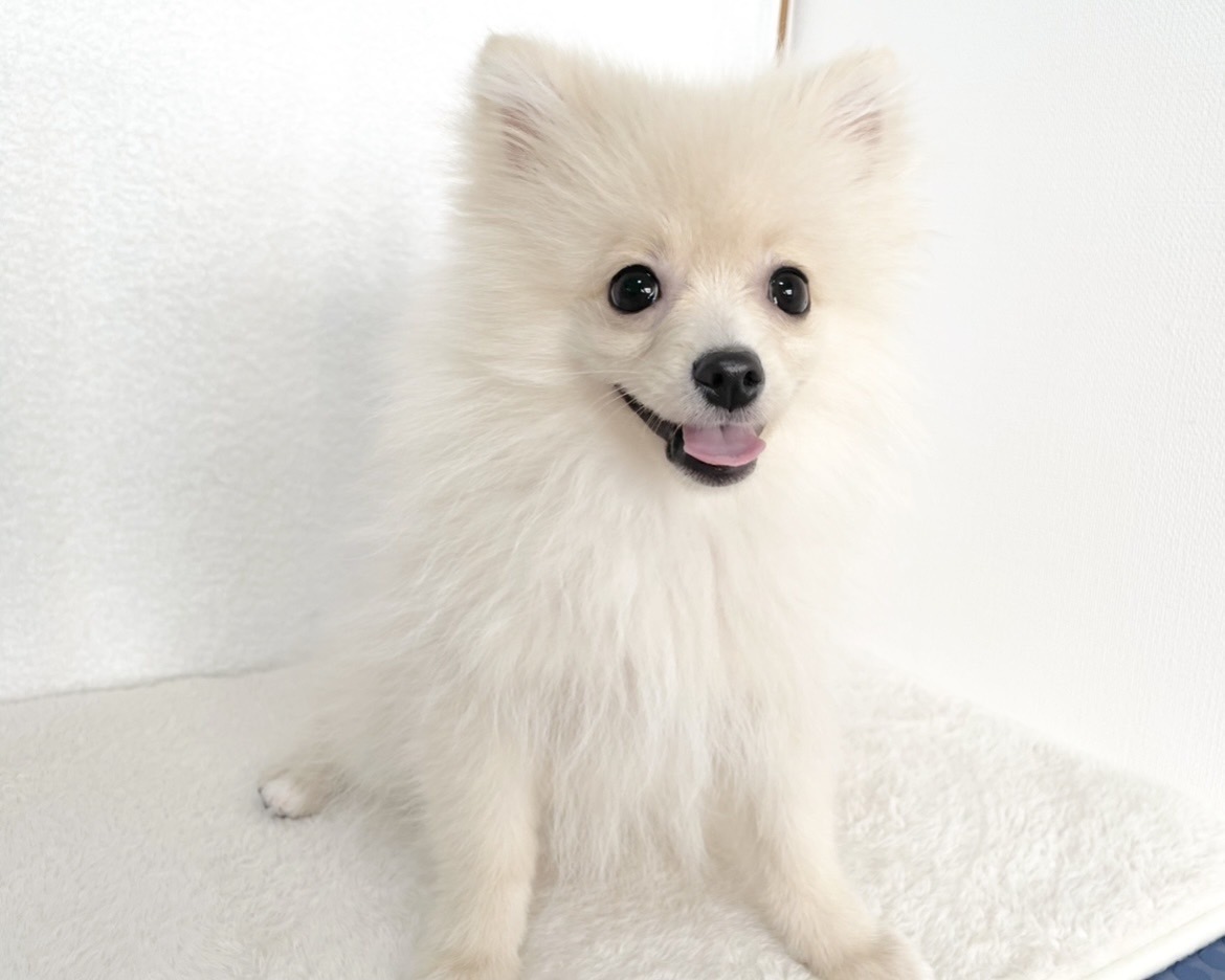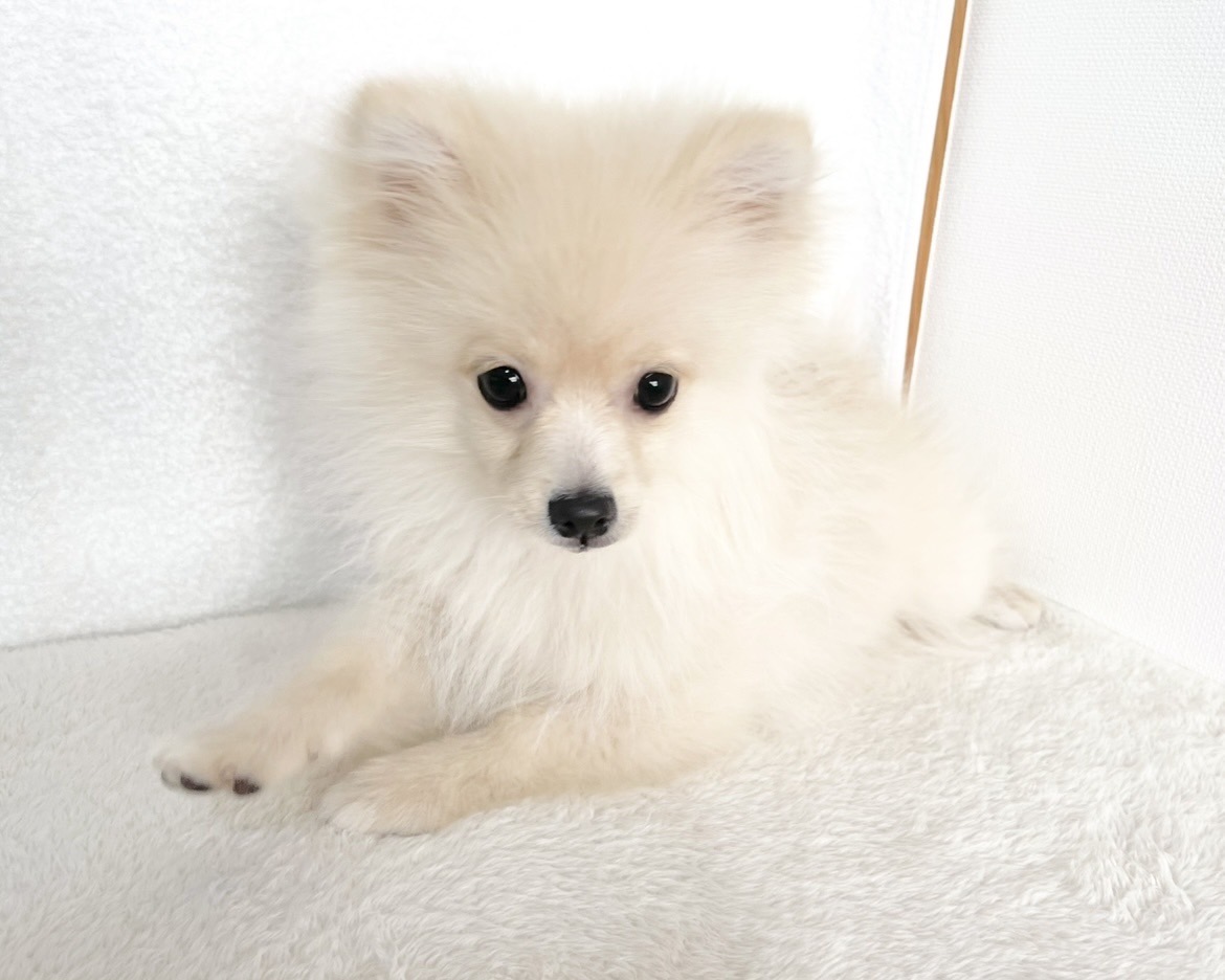 He is a beautiful, tiny, fluffy, cream-colored Pomeranian boy. With his soft, stuffed-animal-like shape and big, watery eyes, he is so cute that even first-timers will want to hug him.