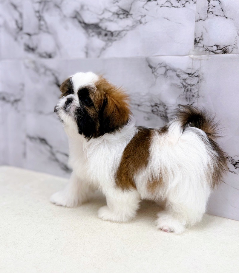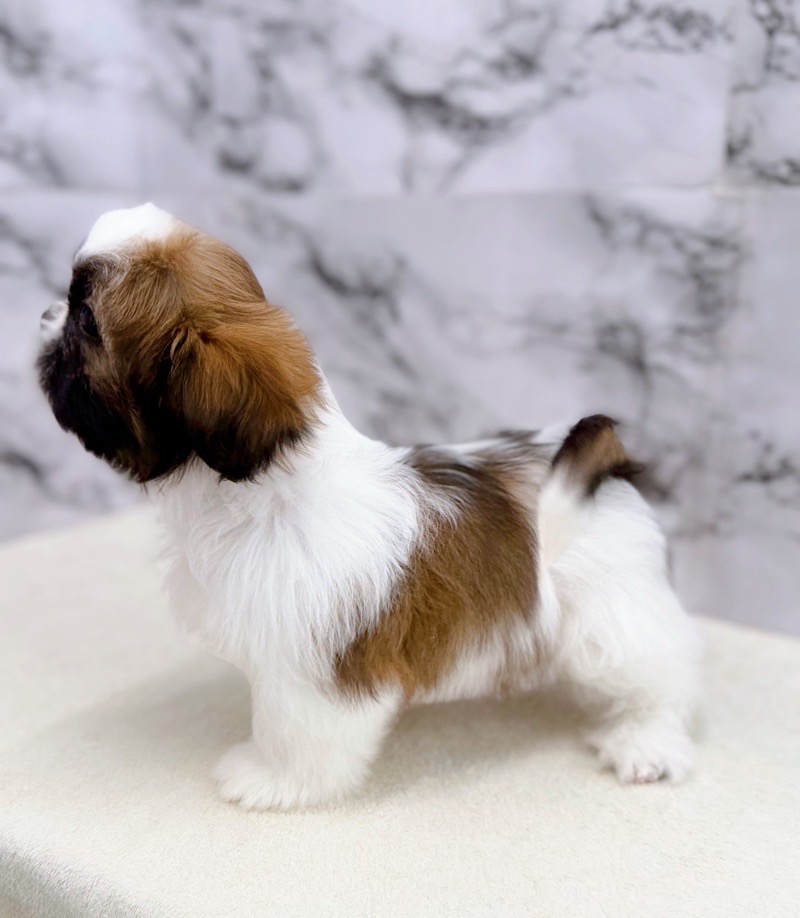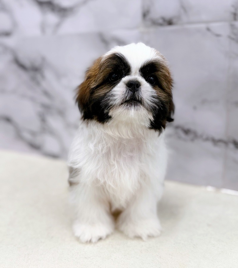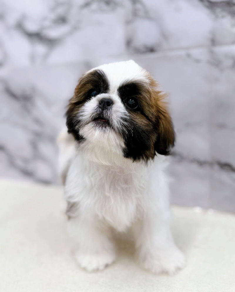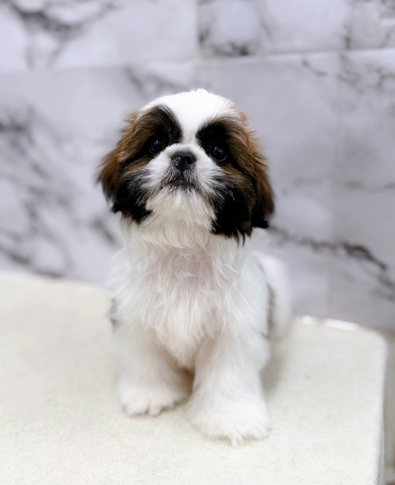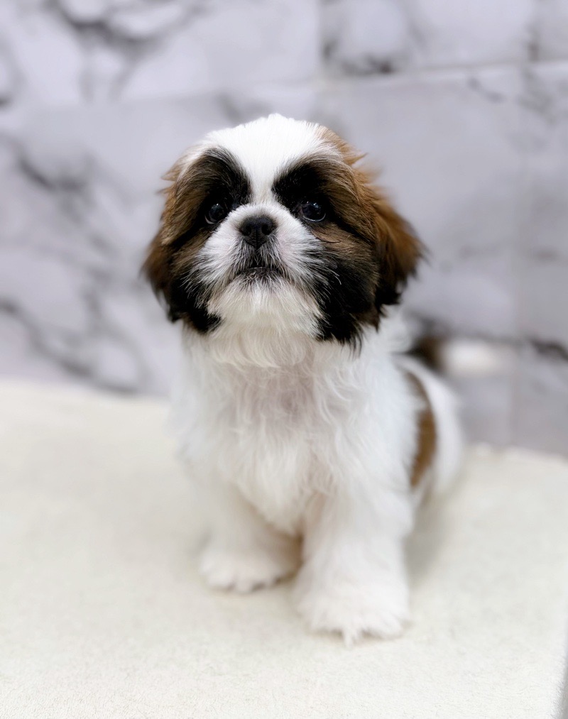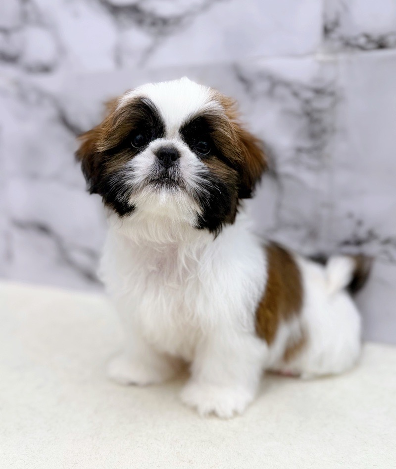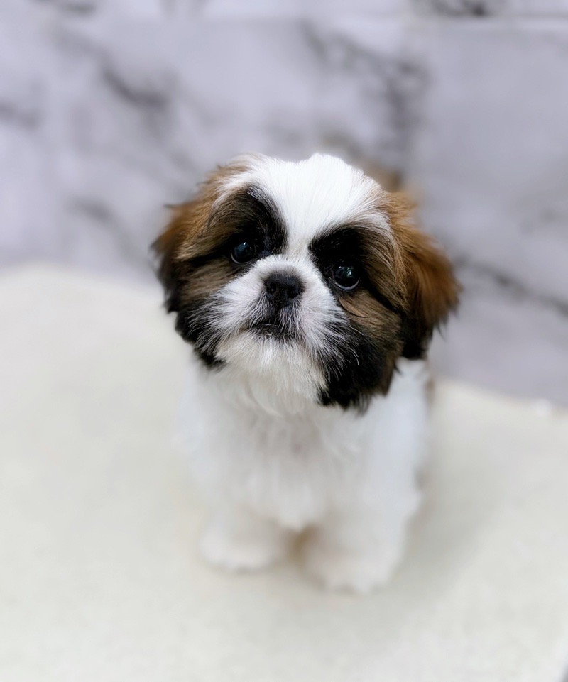 This charming male Shih Tzu has soft, fluffy fur and a charming, round face.