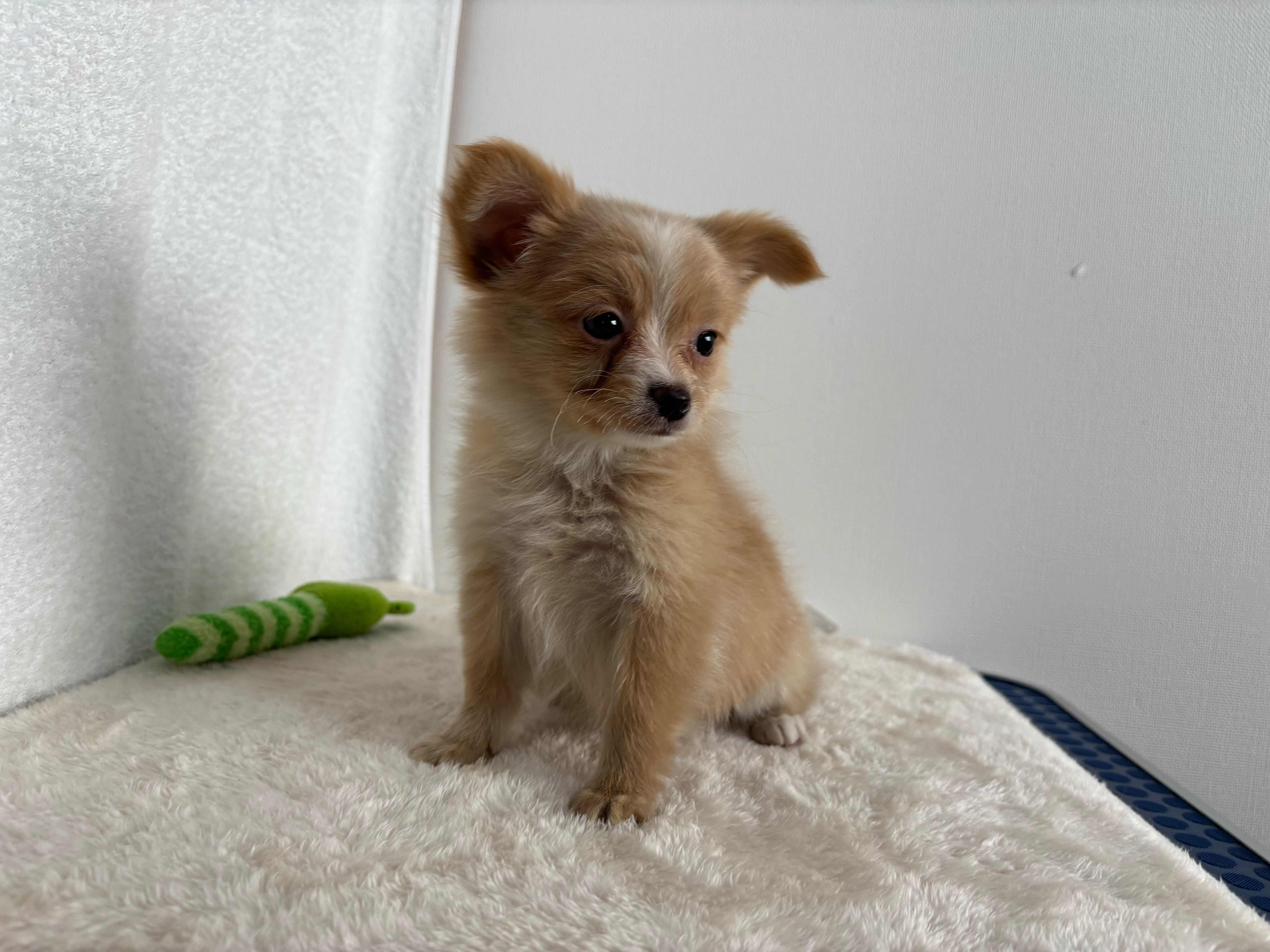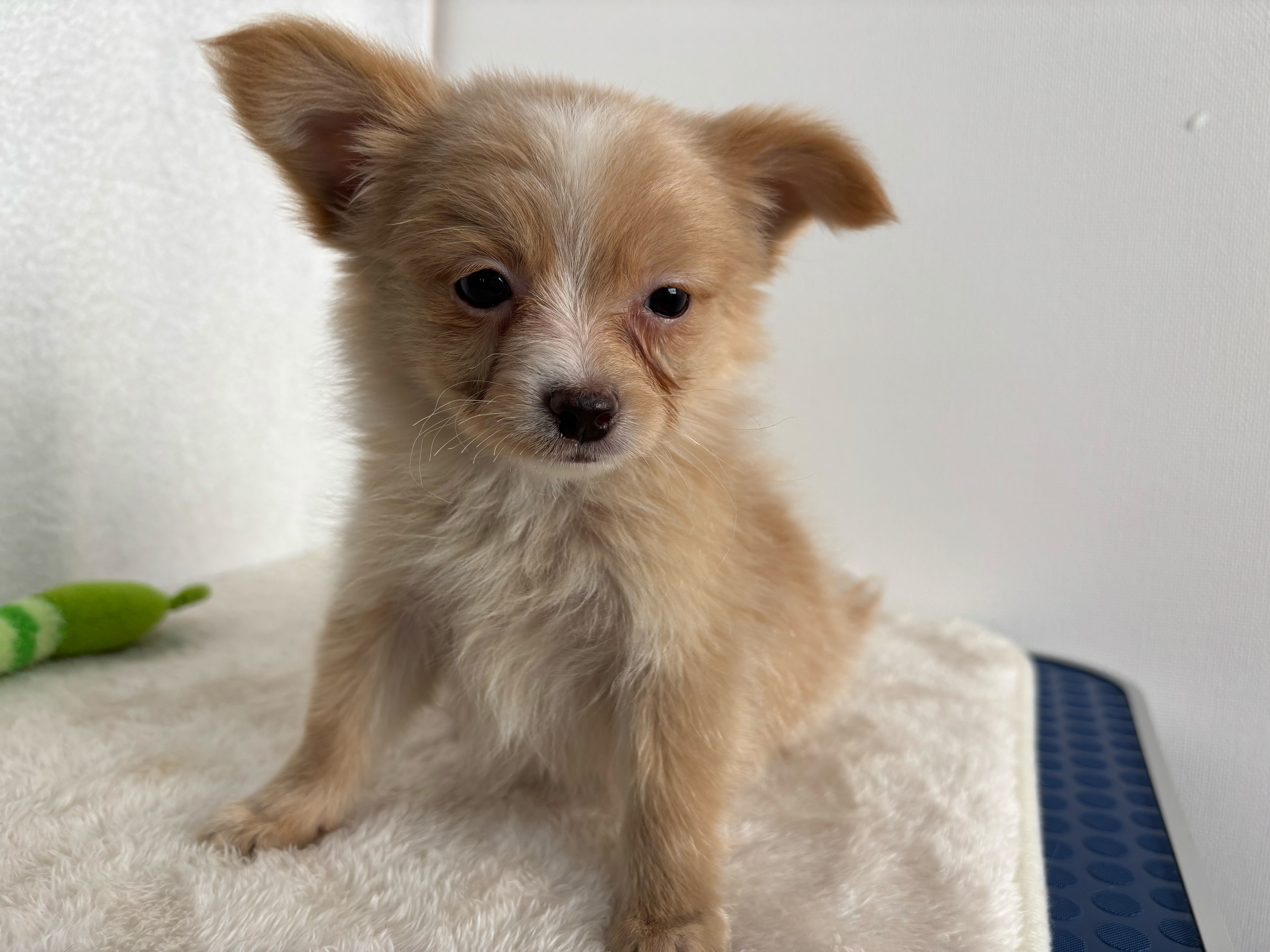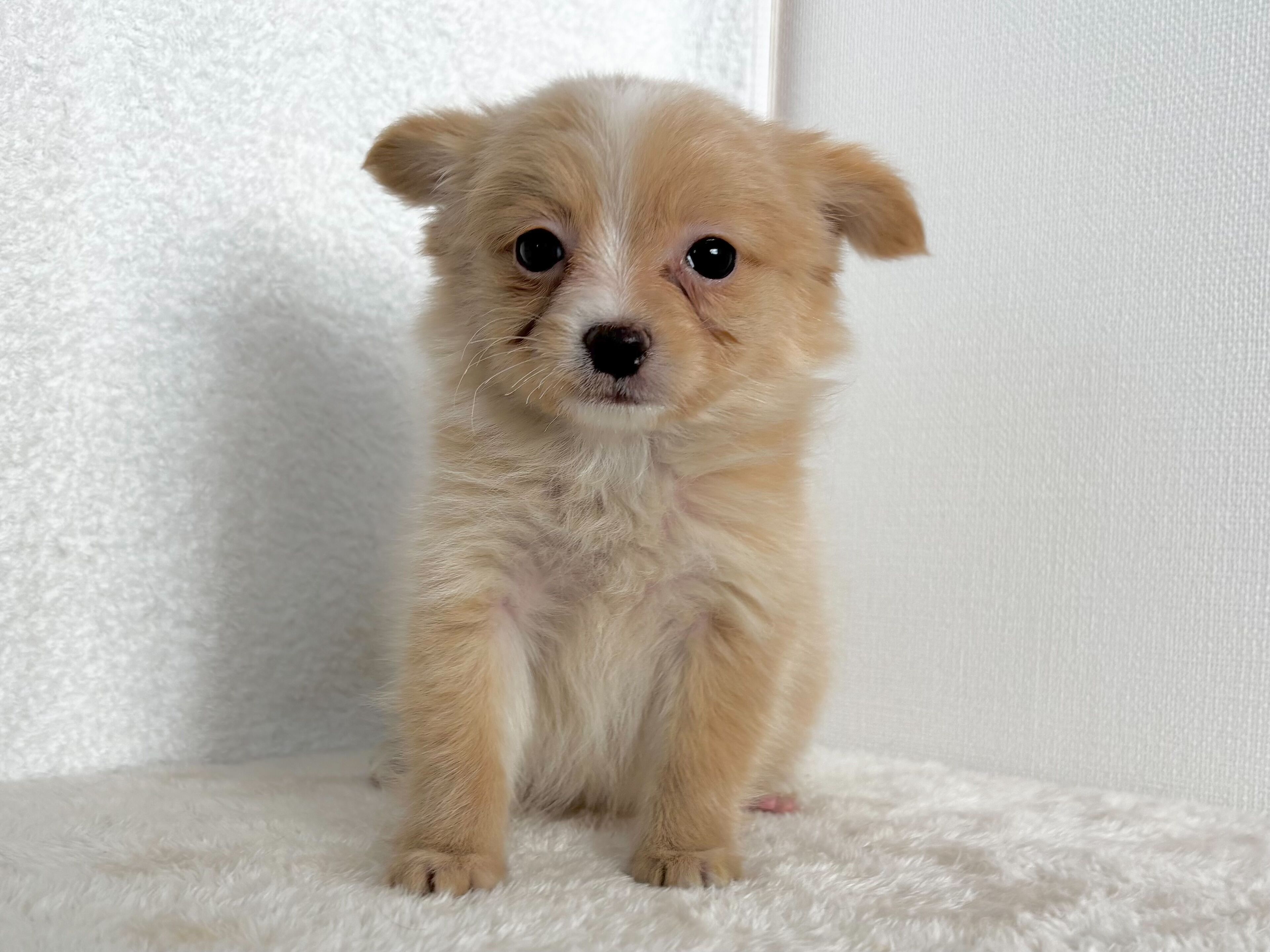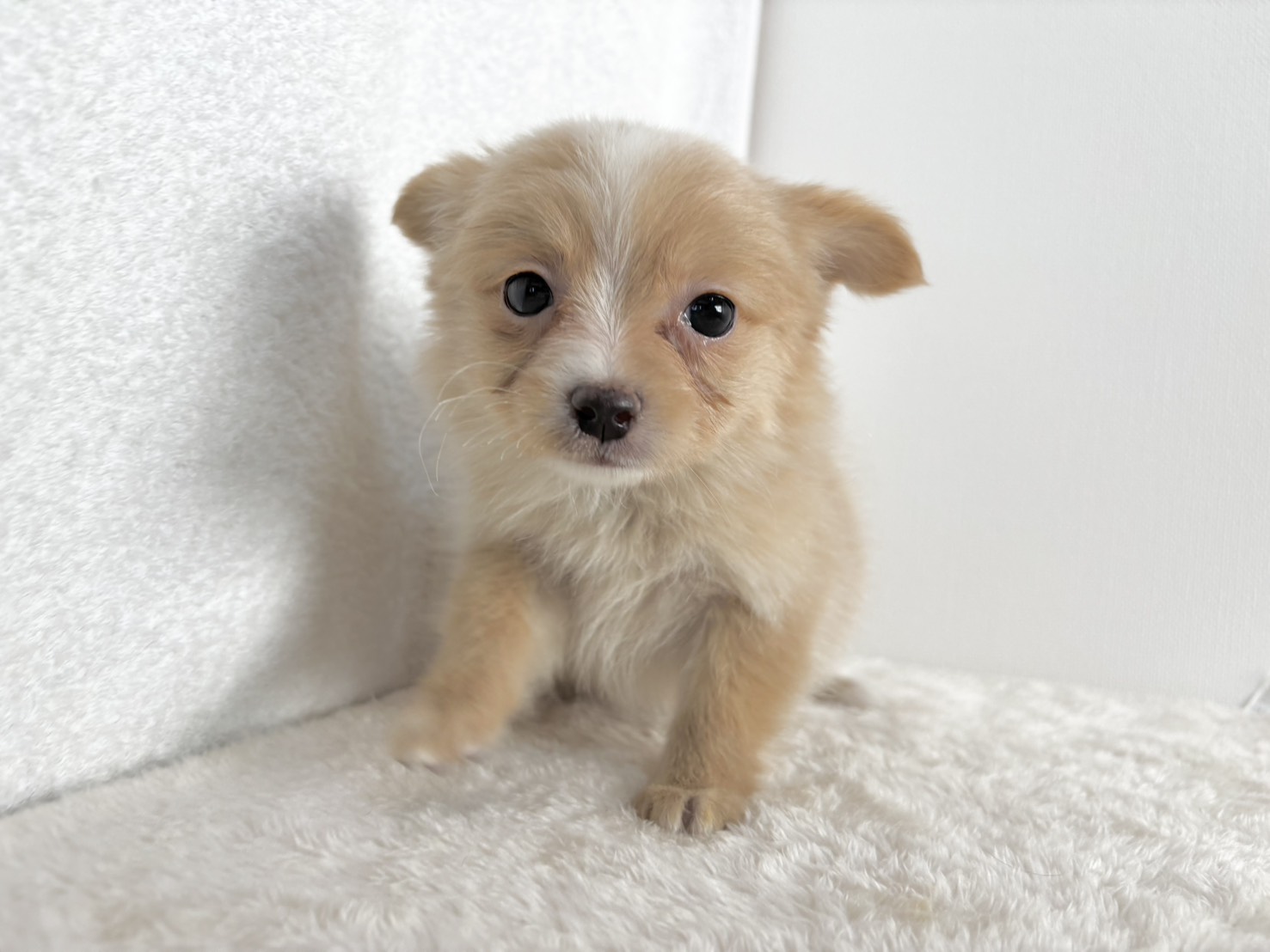 This cream-colored Pomechi dog has an impressive, idol-like face