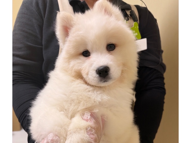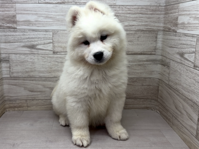 This female Samoyed has charming, pure white, fluffy fur, like a snow fairy. Her voluminous coat makes you want to hug her, and her elegant posture is a presence unique to large Spitz dogs. Her round eyes and adorable expression will naturally warm the hearts of anyone who sees her